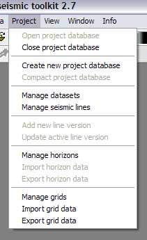 kogeo’s functions for project database management can be accessed from the ‘Project‘ menu: A project database is meant to be a container for informations around your seismic data (like navigation, horizons etc.), making them accessible as fast as possible. Additionally the map-view system in kogeo depends on project databases, a map-view is only available, when a project database is active. The databases themselves are of the MS-Jet ‘.mdb’ format, you can open and edit them for example with MS-Access. Dataset management: Before a project database can be used, it needs to be physically created, this means the table bodies and relationships are defined. To create a database, use the ‘Create new project database’ menu item, which will bring up the corresponding dialog window after you have chosen a name for the new project. You can input some additional information about the new project and edit it’s date and time of creation - these fields are available for many database items; in fact they don’t mean too much. If you like to protect your database, you might specify a password, which needs to be entered when the database is opened later on. After the database is created you’re asked to create on or more ‘datasets’, in which the seismic lines are arranged. A project can contain several datasets, each of them might contain several 2d seismic lines or a single 3d seismic line. The data of one (active) dataset is displayed on the map-view in the end. If not directly after the database creation, the dataset management is accessible using the corresponding menu item/dialog window: For each dataset you create, a name (+additional information and date), a type (2d or 3d) and a sample rate (all seismic lines in one dataset need to have the same) must be specified; the dataset itself is created with the ‘add set’ button. Afterwards it appears on the list in the lower part of the dialog window. A dataset can be deleted from the database by choosing it on the list and pushing the ‘remove set’ button; if a dataset is removed, all seismic data in it is deleted as well. To open a project database, choose the ‘Open project database’ menu item. If the selected database has the correct format, you’re prompted to pick a working dataset; in a newly created database it will be empty, of course. If everything is correct, the map-view window will appear indicating that kogeo is ready to work with the database. Seismic line management: A seismic line you want to be included in the active dataset needs to be imported first and it’s navigation needs to be specified; line navigation must be in decimal degrees for putting a line into a project dataset, so you’ll maybe have to transform your navigation first. The map-view can be displayed in projected coordinates later on, refer to the user interface section about this. If a line imported and the specified navigation matches the actual projection settings of the map-view, it is already displayed on the map (in orange, by default), but not selectable by clicking like the data that is in the active dataset (displayed in red). When line and navigation are properly set up, use the ‘Manage seismic lines’ menu item to open the line management dialog window: Press ‘add line’ to proceed to the ‘add seismic line’ dialog: 2d lines can be treated partially, when the corresponding option is activated in the upper part. Below specify a name and date plus a standard colorbar, which is used when the data is displayed later on. Pressing ‘ok’ finally starts the import process. If everything works out, you’ll find the new line on the list and you might leave the line manager. Every seismic line might exist in several versions in a dataset (for example the results of different processing steps); the original version is always called ‘Standard’ and can not be changed or deleted, only if the seismic line as a whole is removed from the database (by clicking the ‘remove line’ button of the line management dialog). To access the line version management, select the line on the list and click the ‘line versions’ button. In the ‘line versions’ dialog you can remove versions (except from ‘Standard’) or change their standard colors. The ‘activate, ok’ button closes this dialog and sets the selected version active, which means that it will be used as the default version, when the line is displayed. The active versions are indicated in the line management list. Adding a new line version can be done in two ways. First, you can import a new line version from an external file (must have the same size in samples and traces like the original) and use the ‘add version’ button in the ‘manage seismic lines’ dialog, or you edit your data in kogeo and use the ‘Add new line version’ menu item. Both methods will bring up the ‘add new line version’ dialog window: Specify name, creation date and standard colors for the new version and confirm the settings by clicking ‘ok’. If you have edited a version other than ‘Standard’, you might also choose the ‘Update active line version’ menu item, to store the new data under the old version entry in the database. Horizon management: Horizons can be created, removed and edited in the ‘manage horizons’ dialog, opened by the corresponding menu item: Setup a name and display style for a new horizon (plus description and date, of course) and press ‘add horizon’ to add it to the list. Horizons are not bound to a specific dataset, they’re accessible throughout the entire project. When you select an horizon on the list, you can remove it from the project or update it’s appearance or name (change the re-called settings in the upper part of the dialog). If you uncheck the display option on the list, the respective horizon will not be displayed and can not be edited on data-views. Since the database updates during horizon editing might be time consuming, this 